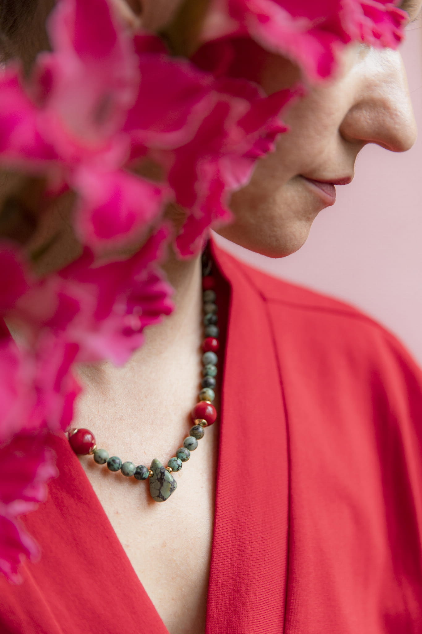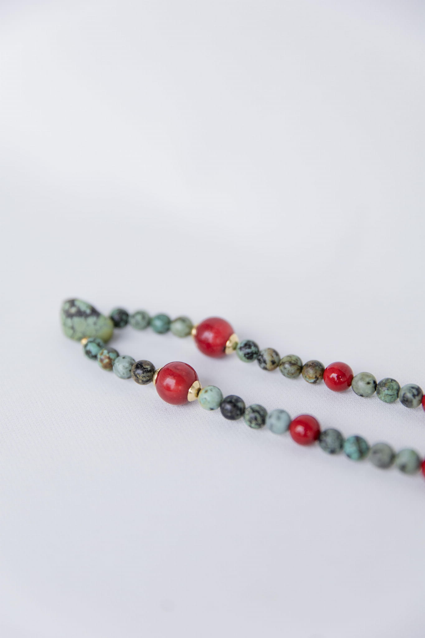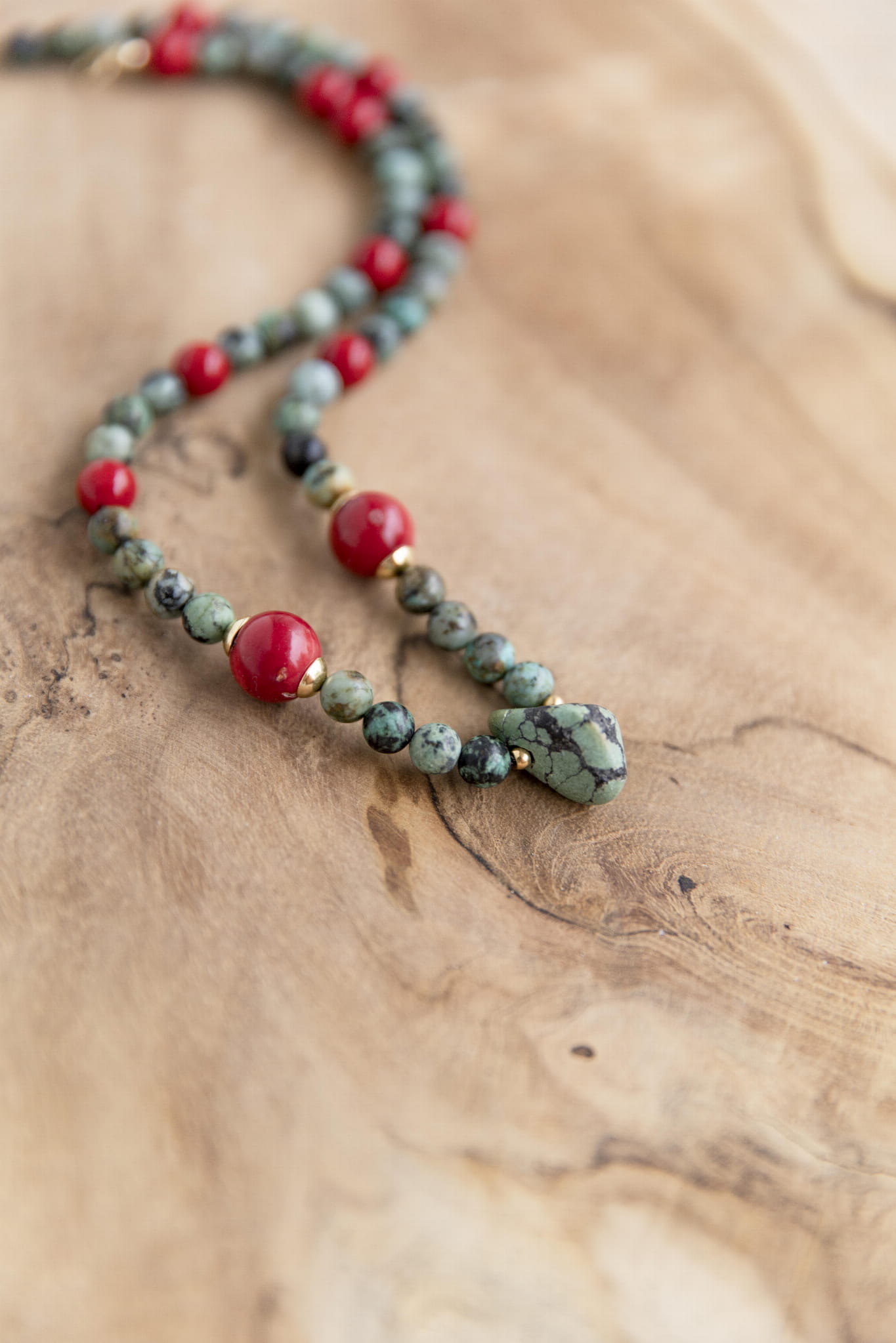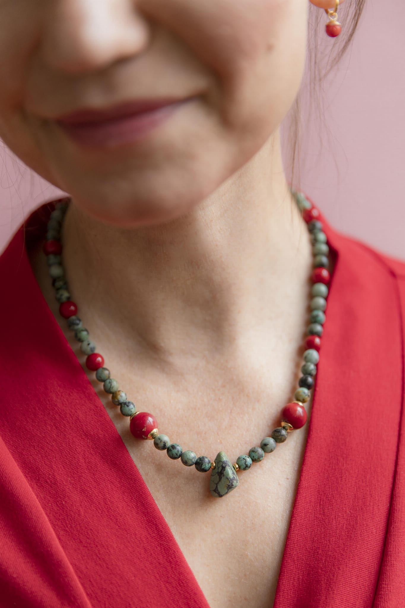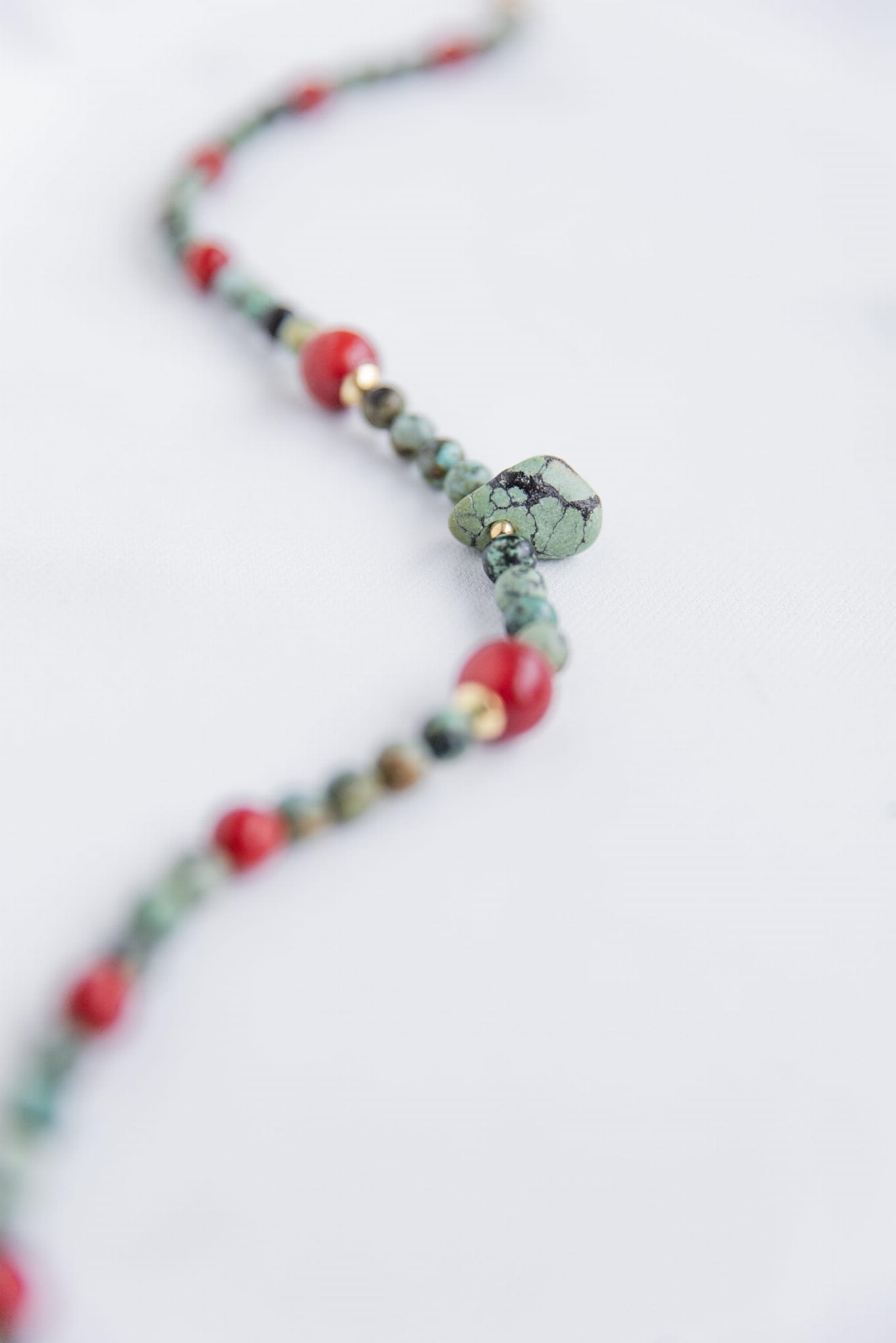 Połączenie turkusu, czerwonego jadeitu i dwóch dużych bryłek koralu przywołuje klimat Tybetu – czystego powietrza, wysokich przestrzeni, oddechu, który sięga głęboko. To kompozycja intensywna i odważna, a jednocześnie zrównoważona. Jak wolność zakorzeniona w sercu.